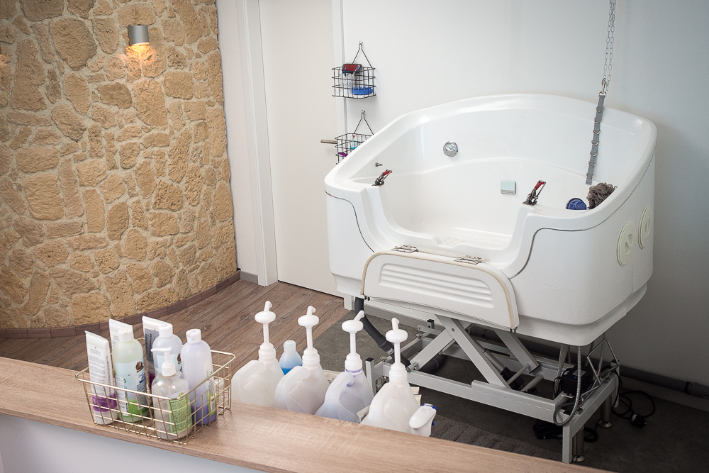 beinhaltet baden mit hochwertigem Shampoo, einmassieren der Thalasso-Meerschlamm-Pflegekur, Föhnen, Bürsten, Ohren-, Pfoten- und Krallenpflege